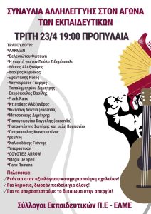 Συναυλία αλληλεγγύης στον αγώνα των εκπαιδευτικών για δημόσια δωρεάν παιδεία για όλους, ενάντια στην αξιολόγηση-κατηγοριοποίηση-εμπορευματοποίηση της παιδείας, στον αυταρχισμό και το χτύπημα του δικαιώματος στην απεργία διοργανώνουν οι Σύλλογοι Εκπαιδευτικών ΠΕ και ΕΛΜΕ Αττικής την Τρίτη 23 Απρίλη, 7μ.μ., στα Προπύλαια
