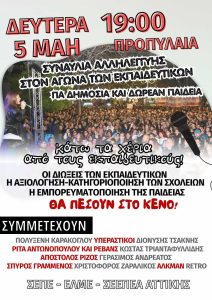 Τα εκπαιδευτικά σωματεία που υπογράφουμε το Δελτίο Τύπου, αποφασίσαμε να προχωρήσουμε σε συνδιοργάνωση μεγάλης συναυλίας στα Προπύλαια τη Δευτέρα 5 Μάη 2025 19:00 με τη συμμετοχή πολλών καλλιτεχνών, ως μορφή συνέχισης του αγώνα ενάντια σε όλες τις συνδικαλιστικές διώξεις συναδέλφων. Ταυτόχρονα, σκοπεύουμε να αναδείξουμε το σύνολο των αιτημάτων μας που αφορούν τα δικαιώματα των μαθητών μας στη μόρφωση.
