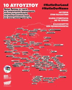 - Στηρίζουμε και καλούμε τα μέλη μας να συμμετέχουν στις πολυάριθμες εκδηλώσεις αλληλεγγύης στην Παλαιστίνη της 10ης Αυγούστου που διοργανώνονται σε όλη τη χώρα (βλ. σχετικό χάρτη και λίστα στο τέλος της ανακοίνωσης).