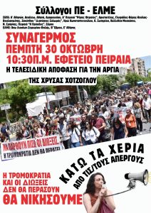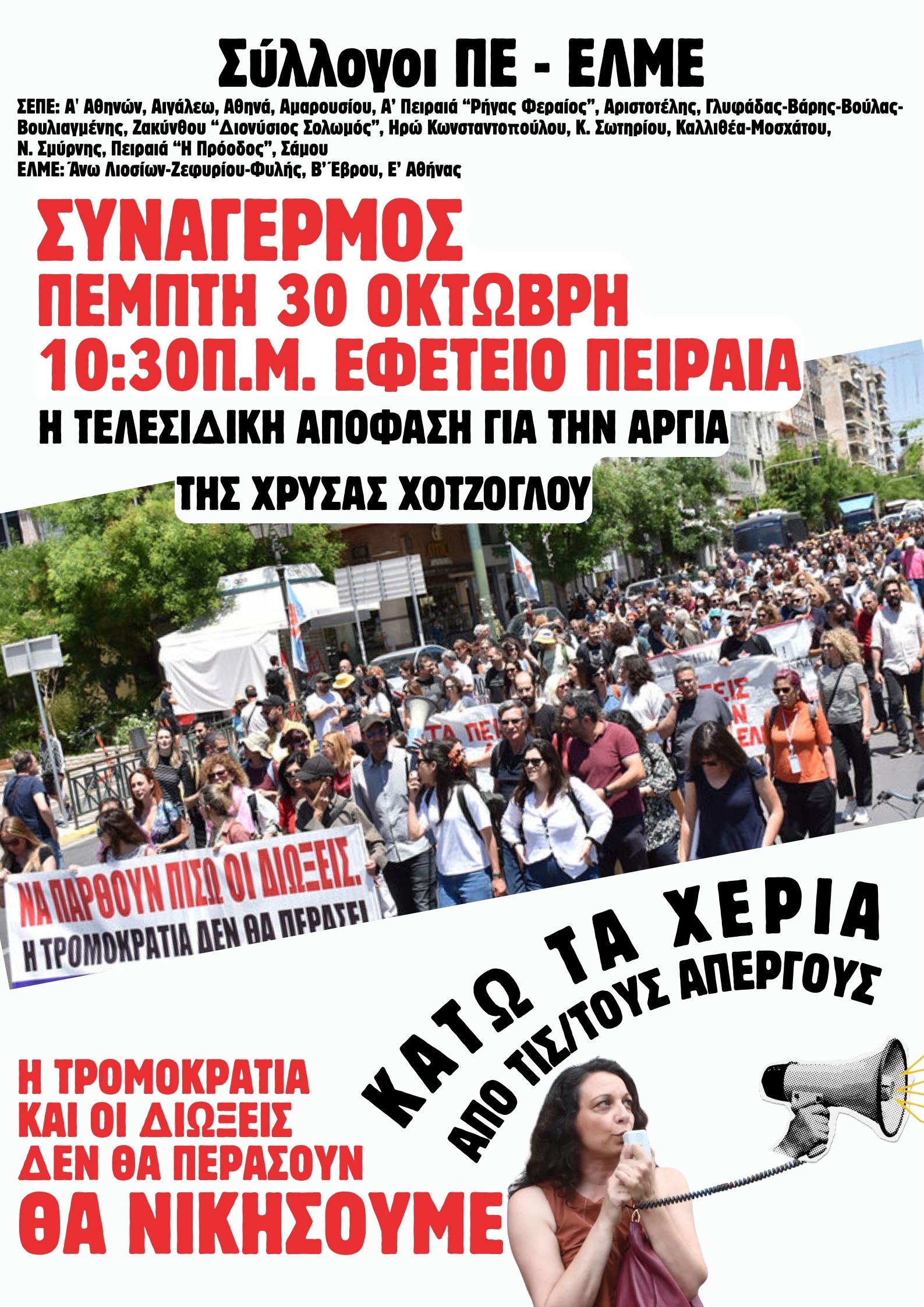 Την Πέμπτη 30/10 εκδικάζεται η αίτηση ακύρωσης της Δυνητικής Αργίας της Χρύσας Χοτζόγλου στο Διοικητικό Εφετείο Πειραιά το οποίο θα επικυρώσει ή θα απορρίψει την απαράδεκτη απόφαση του πρώην Υπουργού Παιδείας να θέσει σε δυνητική αργία την συναδέλφισσα για την συνδικαλιστική της δράση. Μιας απόφασης που πάρθηκε παρά την ομόφωνη αθωωτική απόφαση του Πειθαρχικού Συμβουλίου (με ψήφους 5-0) και κερδήθηκε χάρις στο καθολικό ρεύμα συμπαράστασης που αναπτύχθηκε ανάμεσα στον κόσμο της εκπαίδευσης αλλά και ευρύτερα.