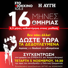 «Στο Κόκκινο 105.5», στους οποίους οφείλονται δεδουλευμένα 4,5 (!) μηνών. Η συνέπεια της αδιανόητης συνεχιζόμενης «στάσης μισθοδοσίας» εκ μέρους του ιδιοκτήτη (δηλαδή του ΣΥΡΙΖΑ) έχει οδηγήσει σε αποχώρηση πολλών δημοσιογράφων – αλλά και άλλων εργαζόμενων – ενώ όσοι/ες εξακολουθούν να εργάζονται αντιμετωπίζουν συνακόλουθα εμπόδια στην καθημερινή μάχη για βιοπορισμό.