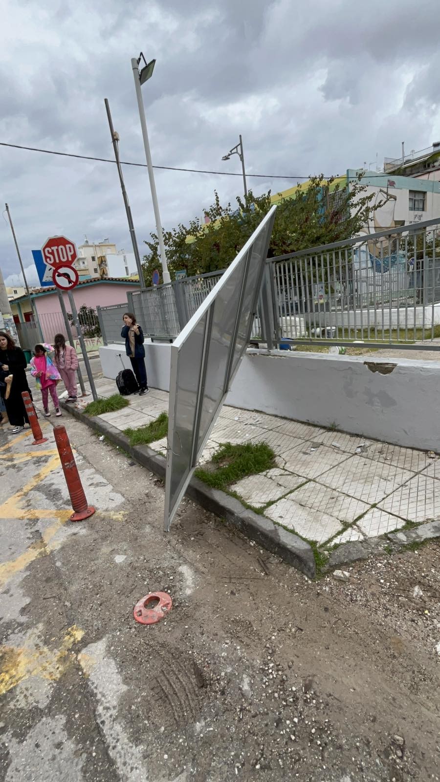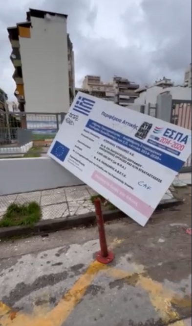 τεράστια ταμπέλα που ενημέρωνε ότι η οικοδόμησή του ξεκίνησε το …2019 παρασύρθηκε από τον ισχυρό άνεμο τη στιγμή που σχολούσαν τα παιδιά του ολοήμερου. Για μια ακόμα φορά, ευτυχώς που δεν είχαμε κάποιο τραυματισμό.