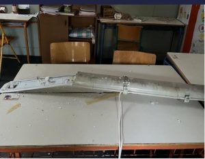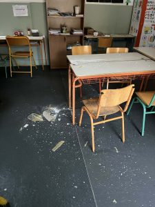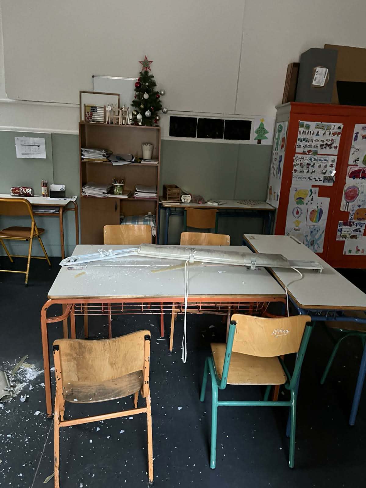Μία ακόμα δυσάρεστη έκπληξη αντιμετώπισαν οι εκπαιδευτικοί του 10ου Ειδικού Δημοτικού Σχολείου Αθήνας το πρωί της Τρίτης 9 Δεκεμβρίου καθώς άνοιξαν τις αίθουσες διδασκαλίας. Σε μία από αυτές, ο μακρόστενος λαμπτήρας φθορίου είχε πέσει πάνω στα θρανία που κάθονται τα παιδιά και είχε γίνει θρύψαλα. Συγκεκριμένα, πρόκειται για μία ακατάλληλη αίθουσα που βρίσκεται δίπλα από το κυλικείο του Μαρασλείου. Μια αίθουσα χωρίς θέρμανση, με το κουρτινόξυλο να κρέμεται από το ένα του στήριγμα. Οι εικόνες μιλούν μόνες τους. Επίσης, τα μέλη του ΔΣ μας που επισκέφτηκαν τον χώρο, διαπίστωσαν ότι το πλαστικό μέρος του λαμπτήρα έχει πολυμεριστεί από την πολυκαιρία, κάτι που σημαίνει ότι υπάρχει γενικότερο ζήτημα με τους λαμπτήρες στα κτίρια του Μαρασλείου.