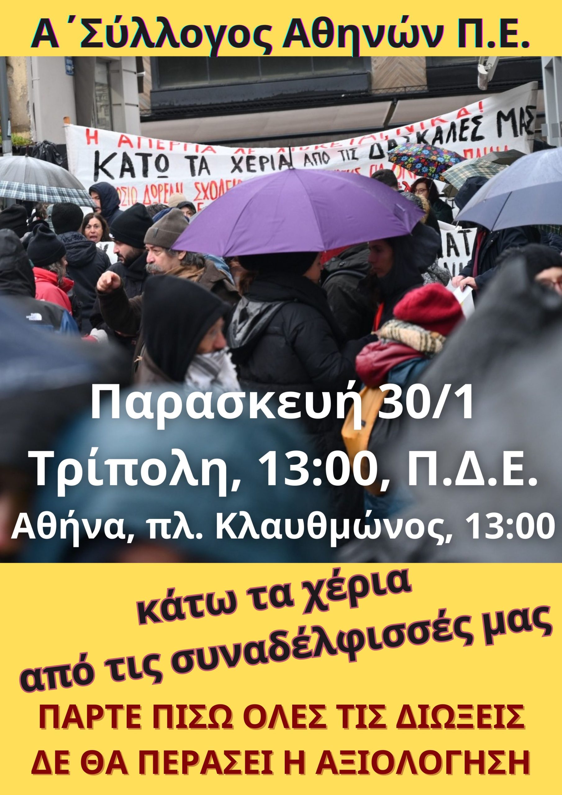 Την Παρασκευή 30 Ιανουαρίου, τρεις συναδέλφισσες εκπαιδευτικοί Π.Ε., μέλη του Συλλόγου Εκπαιδευτικών Π.Ε. Λακεδαίμονος «Ο Πλήθων», καλούνται ξανά σε ακρόαση και απολογία ενώπιον του Α΄ Τμήματος του Πρωτοβάθμιου Πειθαρχικού Συμβουλίου της Π.Δ.Ε. Πελοποννήσου στην Τρίπολη. Οι συναδέλφισσες παραπέμφθηκαν στο πειθαρχικό, όπως και πάνω από 2.000 ανά την Ελλάδα ενώ συμμετέχουν στην απεργία – αποχή από την αξιολόγηση του ν.4823/21 που έχει κηρύξει ο κλάδος με αποφάσεις του (Ολομέλεια Προέδρων 1ης Απριλίου 2024, 93η και 94η Γ.Σ. ΔΟΕ). Απαιτούμε και διεκδικούμε την πλήρη απαλλαγή και δικαίωσή τους. Το πρώτο (έχουν προηγηθεί βεβαίως καθαιρέσεις διευθυντών/ντριών) πειθαρχικό νεοδιόριστων που συμμετείχαν στην απεργία-αποχή επιχειρείται να διεξαχθεί στην Τρίπολη. Ο πρώτος δικαστής παραιτείται και αντικαθίσταται με μία δικαστή τον Δεκέμβριο. Η οποία ζητά τον Ιανουάριο 3 εργάσιμες ημέρες για να προετοιμαστεί για τη δίκη. Αναβολή. Και την ημέρα που είχε οριστεί για τις ακροάσεις, η δικαστής είναι εκεί, αλλά απουσιάζουν δύο διευθύντριες εκπαίδευσης και όλες οι προσπάθειες να βρεθούν οι αναπληρωματικοί τους πέφτουν στο κενό. Νέα αναβολή για τις 30 Ιανουαρίου. Ημέρα που οφείλουμε να τη μετατρέψουμε σε νέες μεγαλύτερες συγκεντρώσεις στην Τρίπολη και πανελλαδικά.