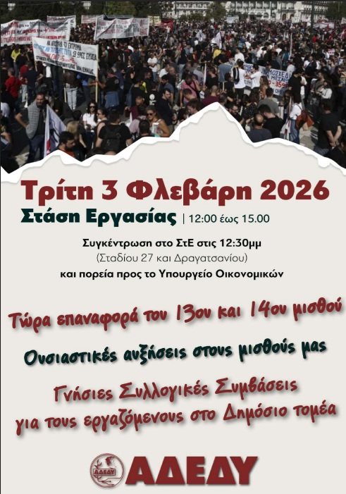 Η Εκτελεστική Επιτροπή της Α.Δ.Ε.Δ.Υ., αποφάσισε την πραγματοποίηση Στάσης Εργασίας την Τρίτη, 3 του Φλεβάρη, από τις 12:00 έως 15.00 για τους εργαζόμενους με κάθε σχέση εργασίας, στις υπηρεσίες του Δημόσιου Τομέα στην Αττική και συγκέντρωση στο ΣτΕ στις 12:30μμ, απαιτώντας να εκδοθεί άμεσα, χωρίς καμιά περαιτέρω καθυστέρηση, απόφαση επαναχορήγησης του 13ου και 14ου μισθού.