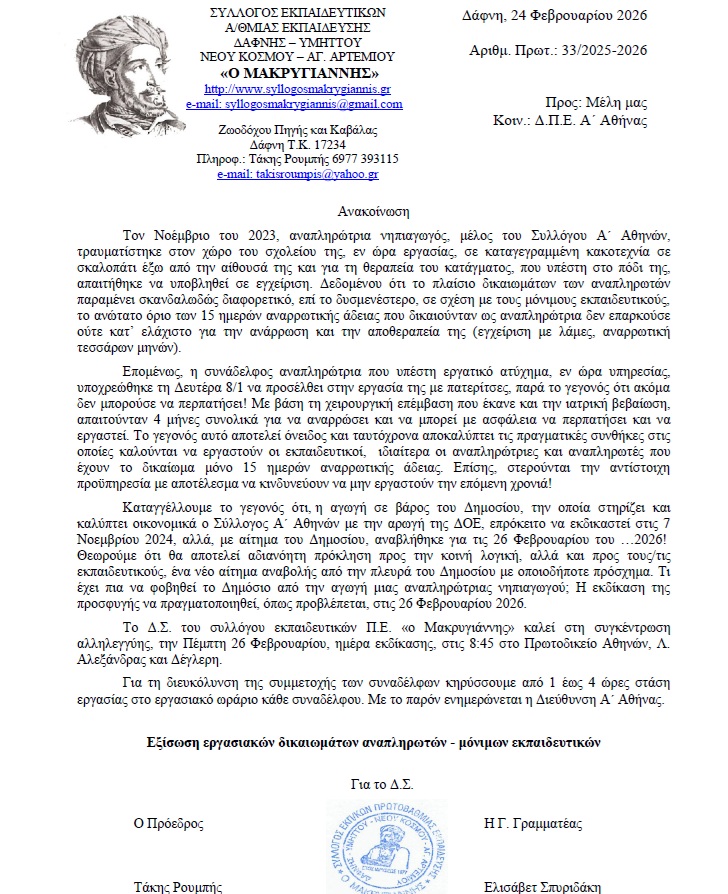 Προς: τα μέλη του Συλλόγου, ΔΟΕ, Συλλόγους Εκπ/κών Π.Ε., στην Διεύθυνση Α’ Αθήνας, συντονιστές σχολικής και προσχολικής αγωγής της περιοχής μας Θέμα: Δικαίωση της αναπληρώτριας νηπιαγωγού για το εργατικό ατύχημα. Συγκέντρωση αλληλεγγύης 26/2, 8:45, Πρωτοδικείο Αθηνών, Λ. Αλεξάνδρας και Δέγλερη Τον Νοέμβριο του 2023, αναπληρώτρια νηπιαγωγός, μέλος του Α’ Συλλόγου Αθήνας, τραυματίστηκε στον χώρο του σχολείου της εν ώρα εργασίας σε καταγεγραμμένη κακοτεχνία στο σκαλοπάτι έξω από την αίθουσά της και για τη θεραπεία του κατάγματος που υπέστη στο πόδι της απαιτήθηκε να υποβληθεί σε εγχείρηση. Ωστόσο, το ανώτατο όριο των 15 ημερών αναρρωτικής άδειας που δικαιούταν ως αναπληρώτρια δεν επαρκούσε ούτε κατ’ ελάχιστο για την ανάρρωση και την αποθεραπεία της (εγχείρηση με λάμες, αναρρωτική 4 μηνών). Γνωρίζουμε ότι το πλαίσιο δικαιωμάτων των αναπληρωτών παραμένει σκανδαλωδώς διαφορετικό, επί το δυσμενέστερο, σε σχέση με τους μόνιμους εκπαιδευτικούς. Επομένως, η συνάδελφος αναπληρώτρια που υπέστη εργατικό ατύχημα, την ώρα υπηρεσίας, υποχρεώθηκε τη Δευτέρα 8/1 να προσέλθει στην εργασία της με πατερίτσες, παρά το γεγονός ότι ακόμα δεν μπορούσε να περπατήσει! Δεδομένου ότι με βάση τη χειρουργική επέμβαση που έκανε και την ακόλουθη ιατρική βεβαίωση, απαιτούνταν 4 μήνες συνολικά για να αναρρώσει και να μπορεί με ασφάλεια να περπατήσει και να εργαστεί, το γεγονός αυτό αποτελεί όνειδος και ταυτόχρονα αποκαλύπτει τις πραγματικές συνθήκες στις οποίες καλούνται να εργαστούν οι εκπαιδευτικοί. Ιδιαίτερα οι αναπληρώτριες και αναπληρωτές που έχουν το δικαίωμα μόνο 15 ημερών αναρρωτικής άδειας. Επίσης, στερούνται την αντίστοιχη προϋπηρεσία με αποτέλεσμα να κινδυνεύουν να μην εργαστούν την επόμενη χρονιά! Καταγγέλλουμε το γεγονός ότι, η αγωγή σε βάρος του Δημοσίου, επρόκειτο να εκδικαστεί στις 7 Νοεμβρίου 2024, αλλά, με αίτημα του Δημοσίου αναβλήθηκε για τις 26 Φεβρουαρίου του …2026! Θεωρούμε ότι θα αποτελεί αδιανόητη πρόκληση προς την κοινή λογική αλλά και προς τους/τις εκπαιδευτικούς ένα νέο αίτημα αναβολής από την πλευρά του Δημοσίου με οποιοδήποτε πρόσχημα. Τι έχει πια να φοβηθεί το Δημόσιο από την αγωγή μιας αναπληρώτριας νηπιαγωγού; Η εκδίκαση της προσφυγής να πραγματοποιηθεί, όπως προβλέπεται, στις 26 Φεβρουαρίου 2026. Από την πλευρά μας ξεκαθαρίζουμε ότι: