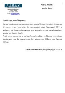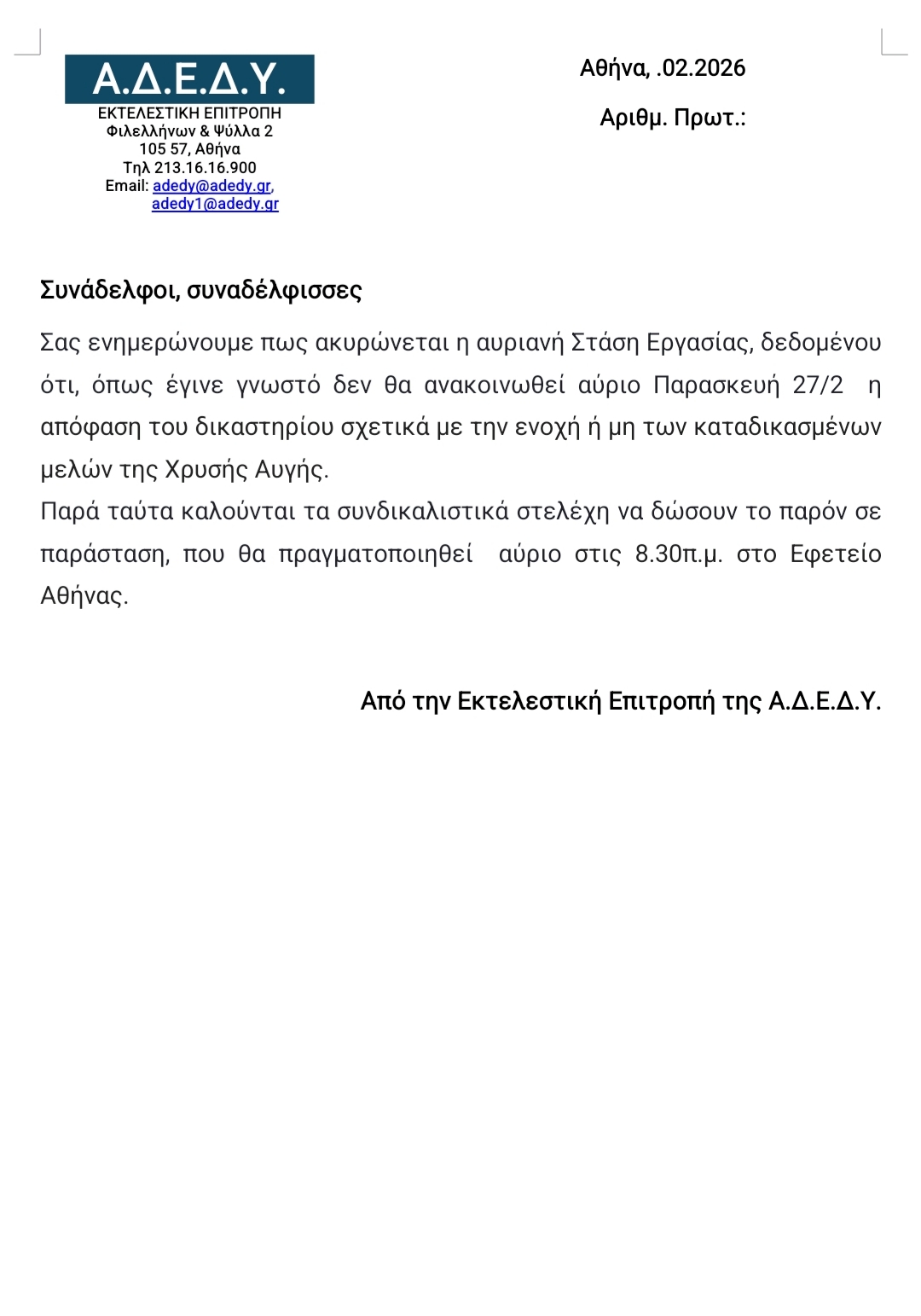 Η Εκτελεστική Επιτροπή της Α.Δ.Ε.Δ.Υ. κηρύσσει Στάση Εργασίας για όλους τους εργαζόμενους, ανεξάρτητα από σχέση εργασίας, σε όλες τις Δημόσιες Υπηρεσίες, τα Ν.Π.Δ.Δ. και τους Ο.Τ.Α. της Αττικής την Παρασκευή, 27 Φλεβάρη 2026, από την έναρξη της βάρδιας το πρωί, έως τις 11.00πμ, τη μέρα που θα ανακοινωθεί η απόφαση του δικαστηρίου σχετικά με την ενοχή ή μη των καταδικασμένων μελών της Χρυσής Αυγής και καλούμε στη συγκέντρωση στις 8.30π.μ. στο Εφετείο Αθήνας. Απαιτούμε την τελεσίδικη καταδίκη της εγκληματικής οργάνωσης της Χρυσής Αυγής και οι ναζί δολοφόνοι, μέλη της, να τιμωρηθούν με την πιο αυστηρή ποινή.