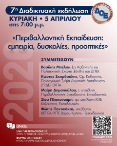 Σε αυτό το πλαίσιο πραγματοποιείται η έβδομη διαδικτυακή εκδήλωση την Κυριακή 5 Απριλίου 2026, με τίτλο: «Περιβαλλοντική Εκπαίδευση: εμπειρία, δυσκολίες, προοπτικές».