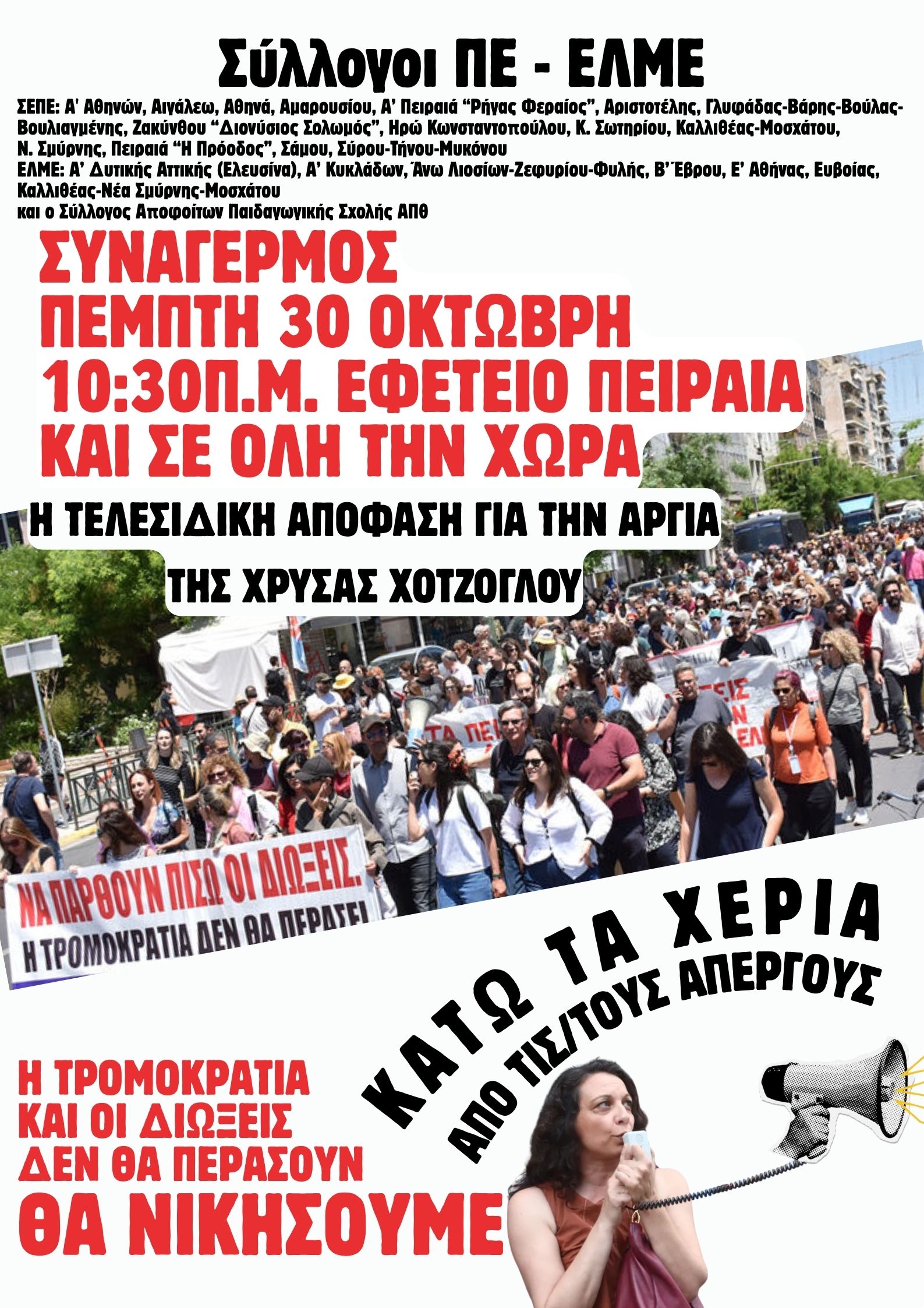 Την Πέμπτη 30/10 εκδικάζεται η αίτηση ακύρωσης της Δυνητικής Αργίας της Χρύσας Χοτζόγλου στο Διοικητικό Εφετείο Πειραιά το οποίο θα επικυρώσει ή θα απορρίψει την απαράδεκτη απόφαση του πρώην Υπουργού Παιδείας να θέσει σε δυνητική αργία την συναδέλφισσα για την συνδικαλιστική της δράση. Μιας απόφασης που πάρθηκε παρά την ομόφωνη αθωωτική απόφαση του Πειθαρχικού Συμβουλίου (με ψήφους 5-0) και κερδήθηκε χάρις στο καθολικό ρεύμα συμπαράστασης που αναπτύχθηκε ανάμεσα στον κόσμο της εκπαίδευσης αλλά και ευρύτερα.
