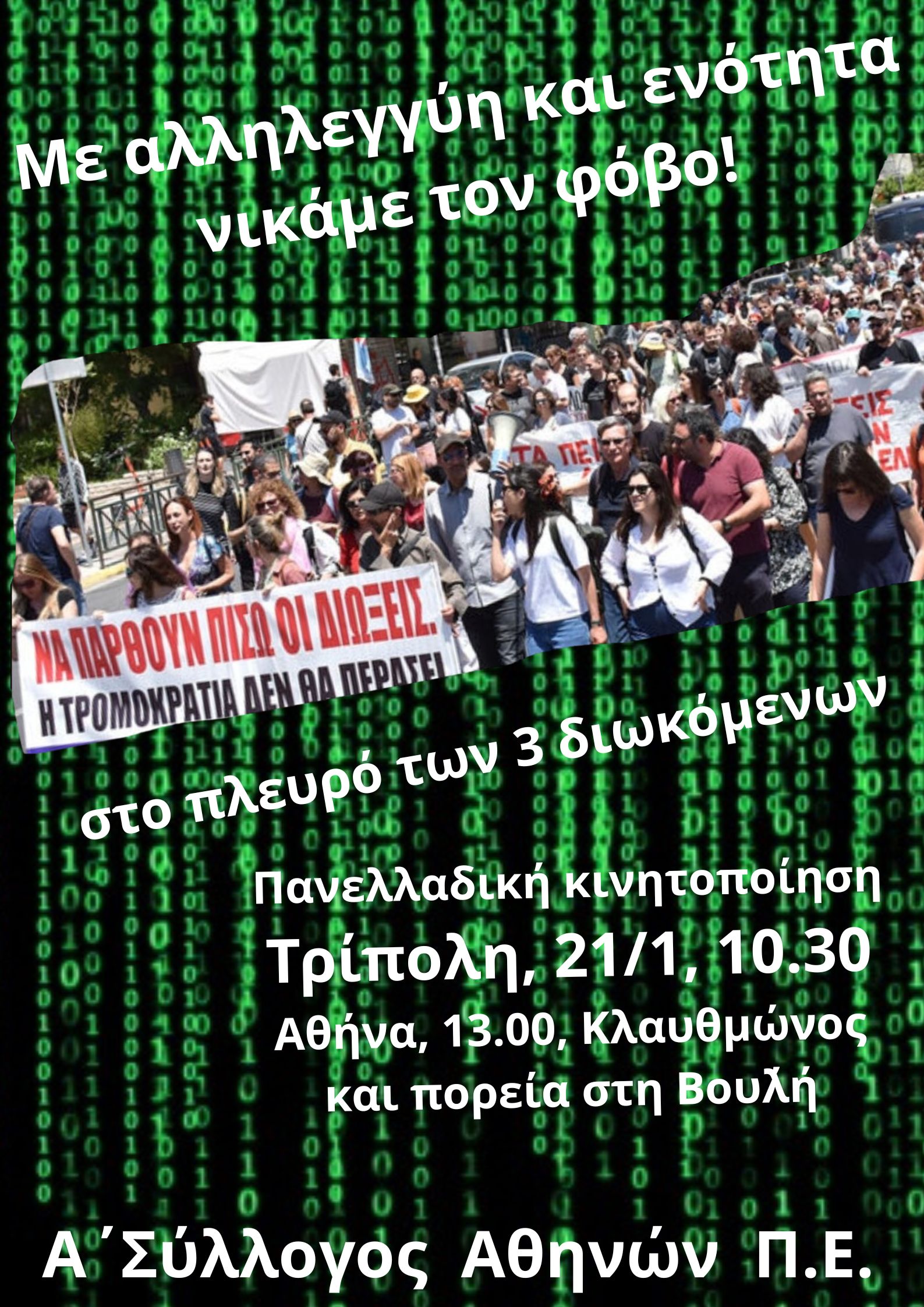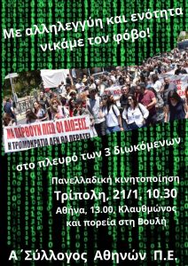 Ταυτόχρονα, καλούμε όσα μέλη μας δε μεταβούν στην Τρίπολη, να συμμετάσχουν στη συγκέντρωση αλληλεγγύης στην Αθήνα, στην Κλαυθμώνος 13:00 και στην πορεία στη Βουλή.