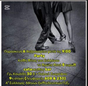 EKΔΗΛΩΣΕΙΣΑ΄ Σύλλογος Αθηνών: Παρασκευή 6 Φεβρουαρίου, κοπή της πίτας του Συλλόγου μας και πάρτυ! 28 Ιανουαρίου 202628 Ιανουαρίου 2026 Παρασκευή 6 Φεβρουαρίσου μετά τις 9:00 Party Κοπή πίτας του Συλλόγου το πρώτο ποτό 5 ευρώ!! cataσκοπος bar Γρ. Κουσίδη 30Β- Παλαιό Ζωγράφου 9η στάση (Λεωφορεία 608 και 230)
